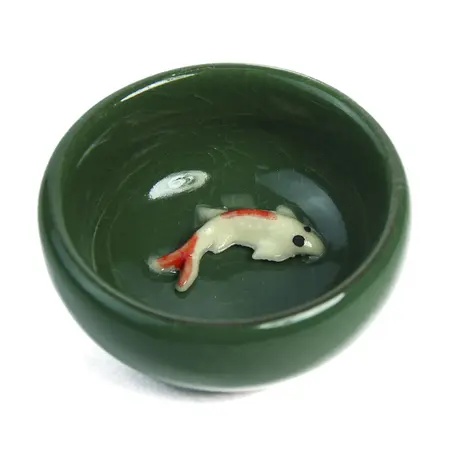 Маленькая широкая пиала из керамики, покрытой зеленой глазурью "кракле", с объемной рыбкой на дне.